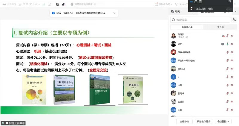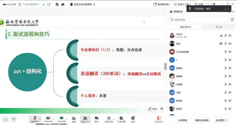 为助力我院考研学子高效备考、精准备战复试环节,切实提升复试应试能力与综合竞争力,学院组织召开了线上的考研复试指导培训会。邀请了我院从南京农业大学引进的博士研究生孙颖老师,中国农业大学研究生张静柔、四川农业大学研究生池慧玲、西北农林科技大学研究生卢振华。