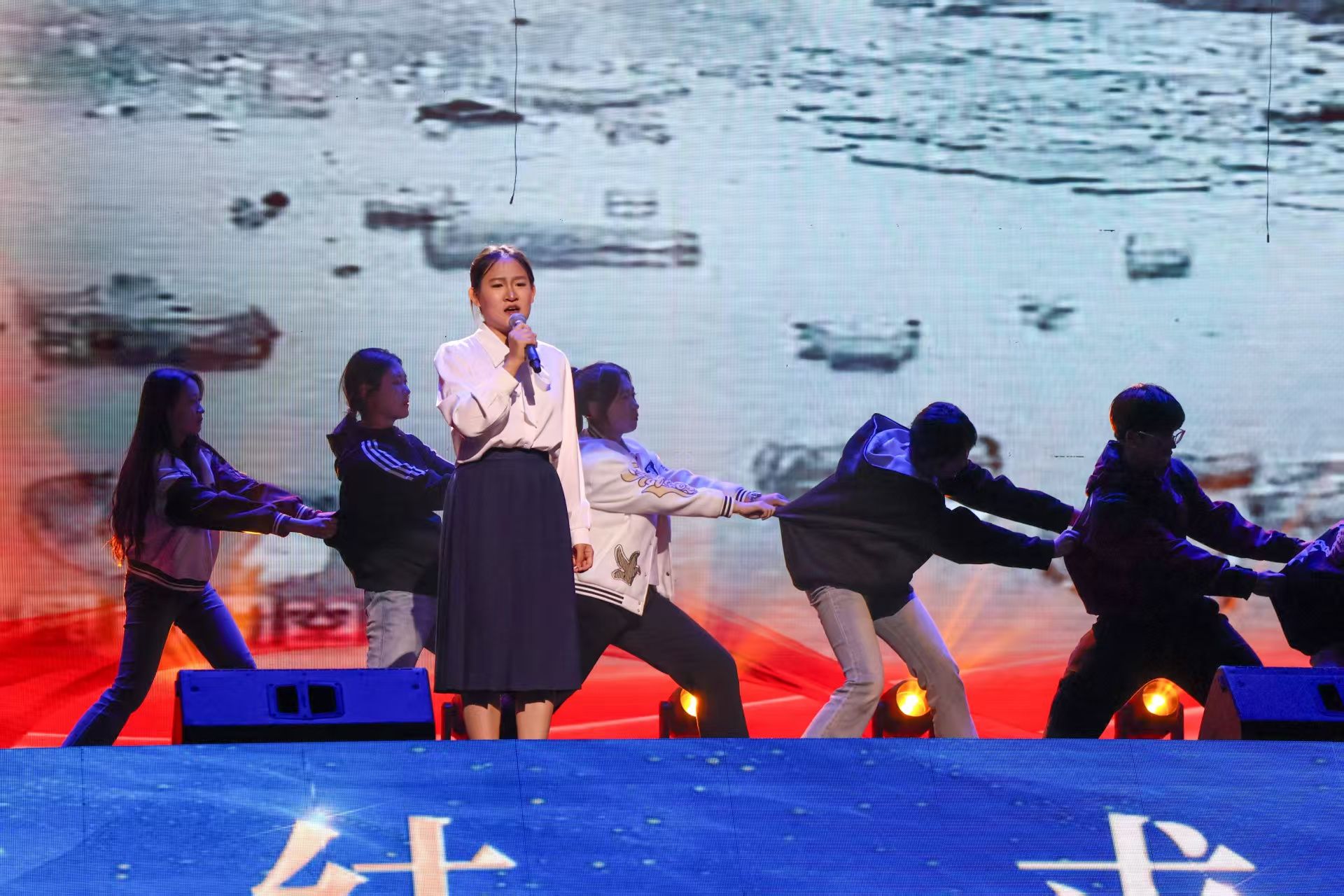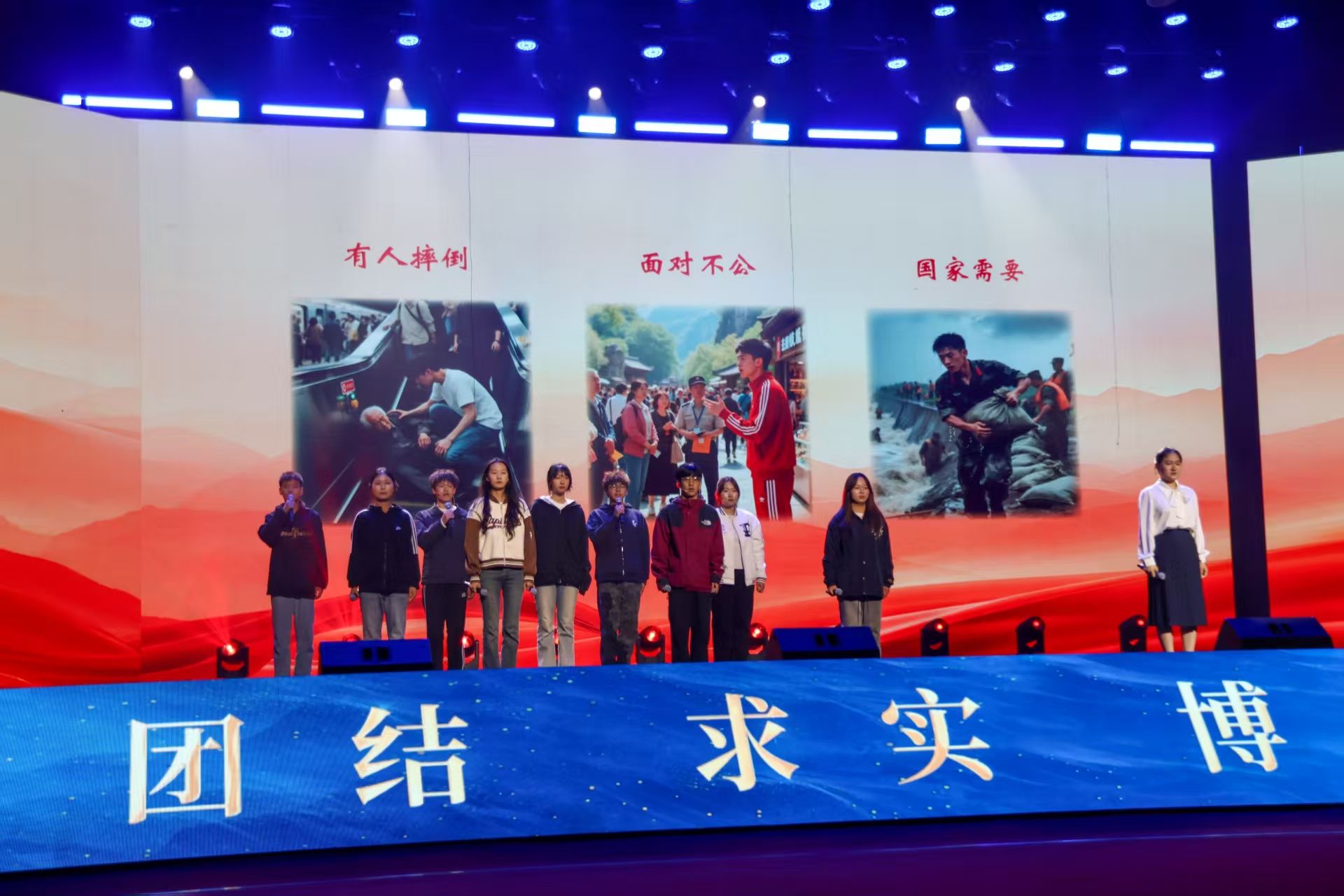 本次活动依托情景诗诵的铿锵表达、歌曲的激荡感染力与舞蹈的飞扬表现力,将思想政治教育深度融入其中,成功呈现一堂有温度、有筋骨、有力量的“舞台上的思政课”,既生动诠释内蒙古各族群众紧扣时代主线、团结奋进的历程,也清晰传递农大人传承革命精神、勇担时代使命的坚定信念。我院在活动中精心呈现主题情景剧《以青春之名,续写英雄之光》,以2002年郝龙彪舍命救同学、叶晓雯与同学们共克困难的真实故事为创作背景,聚焦平凡生活中的善举与逆境中的不屈精神。剧中,郝龙彪舍生忘死的奉献精神、同学们对叶晓雯的温情帮扶,以及叶晓雯直面困境、奋勇拼搏的意志品质,生动诠释了农院学子根植于心的奉献精神、责任担当与大爱情怀,充分彰显新时代青年学子传承优良传统、勇担时代使命的精神风貌。