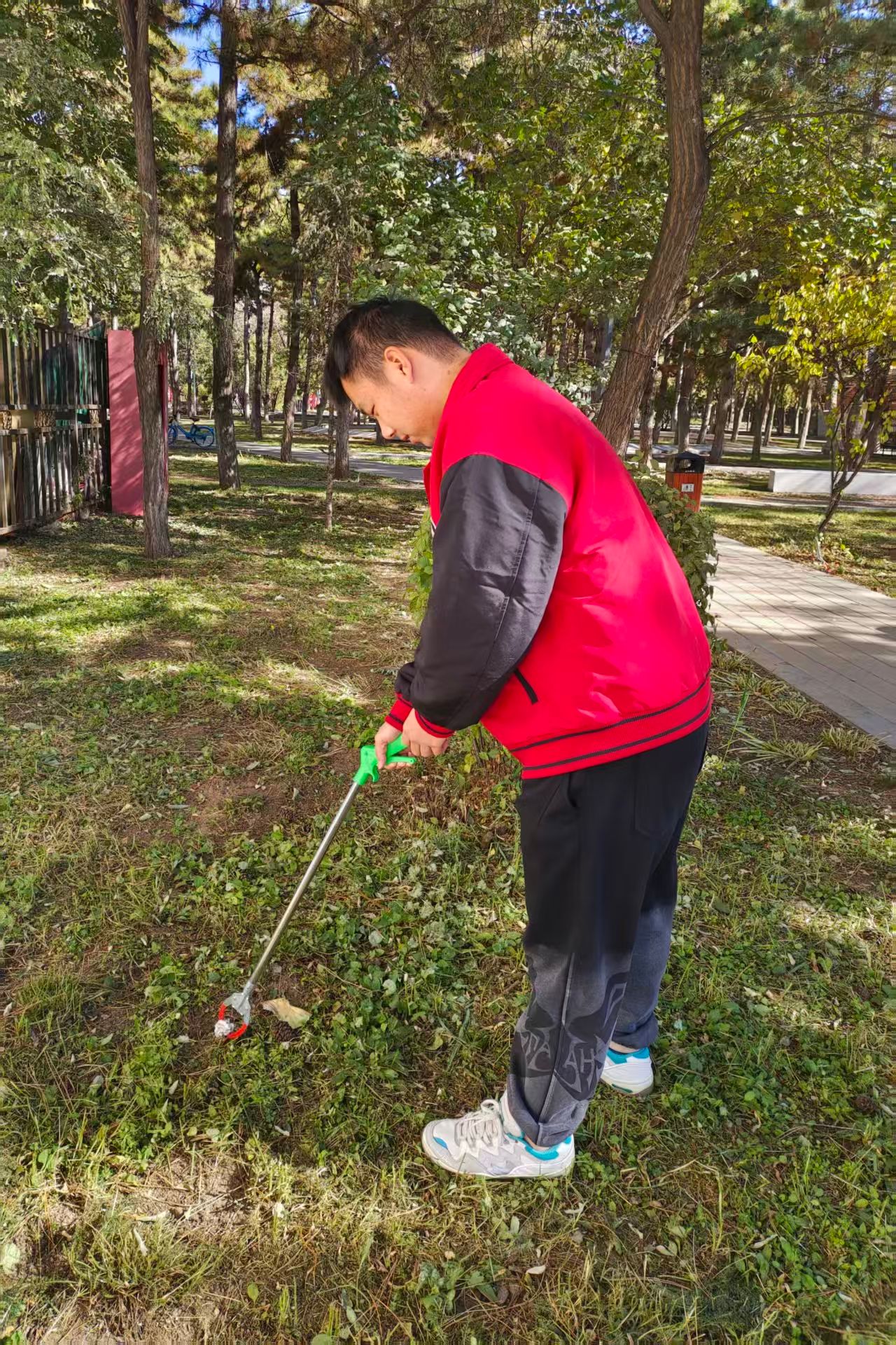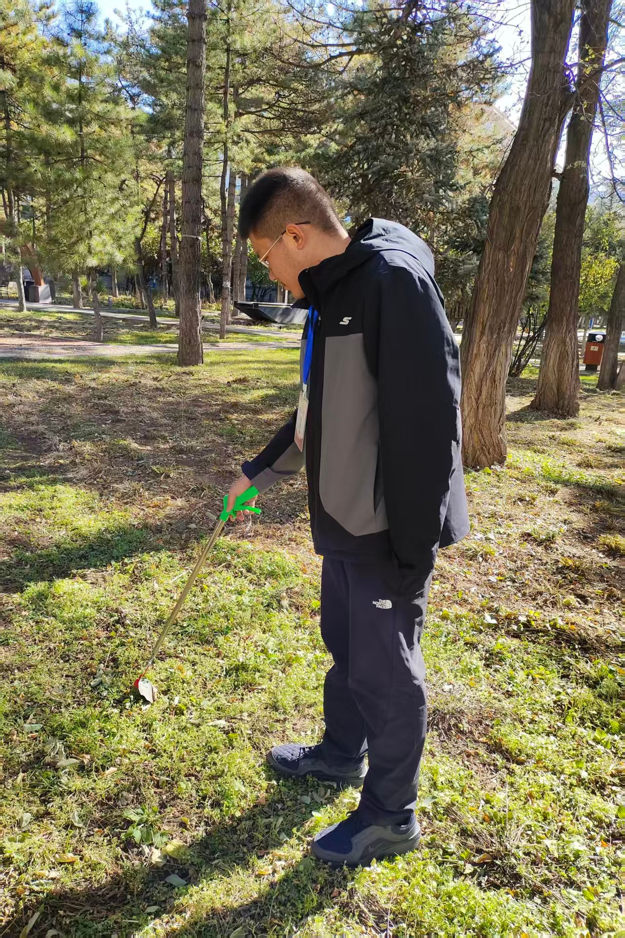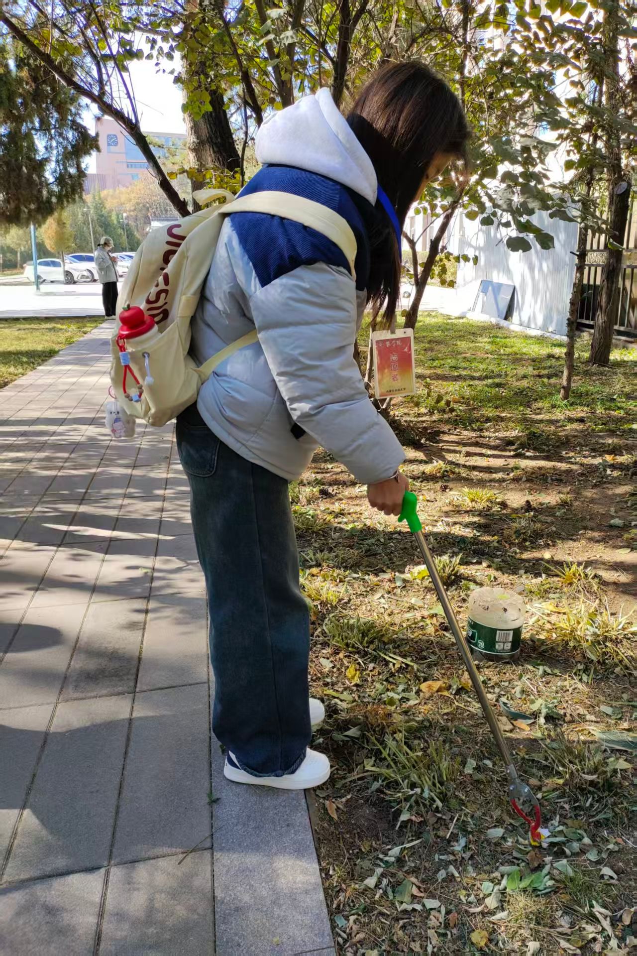 活动伊始,志愿者们穿梭在树木间,手持镊子,俯身清扫路面,认真捡起隐藏在草丛和角落里的纸屑、杂物,配合默契,不放过卫生死角。大家分工明确,尽管寒风阵阵,落叶不断飘落,但志愿者们热情不减。