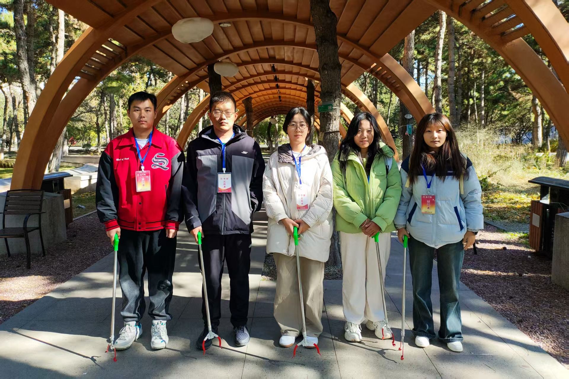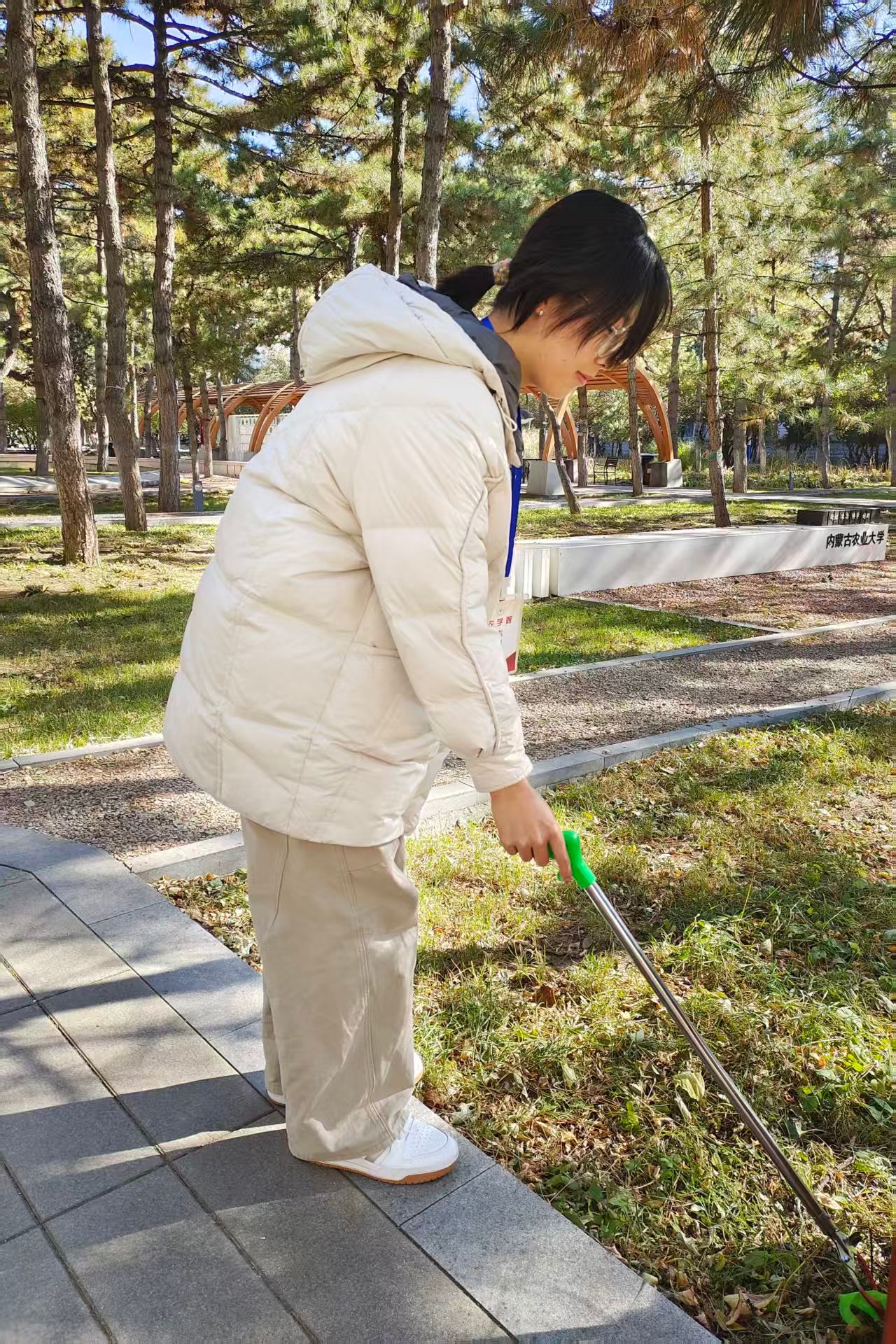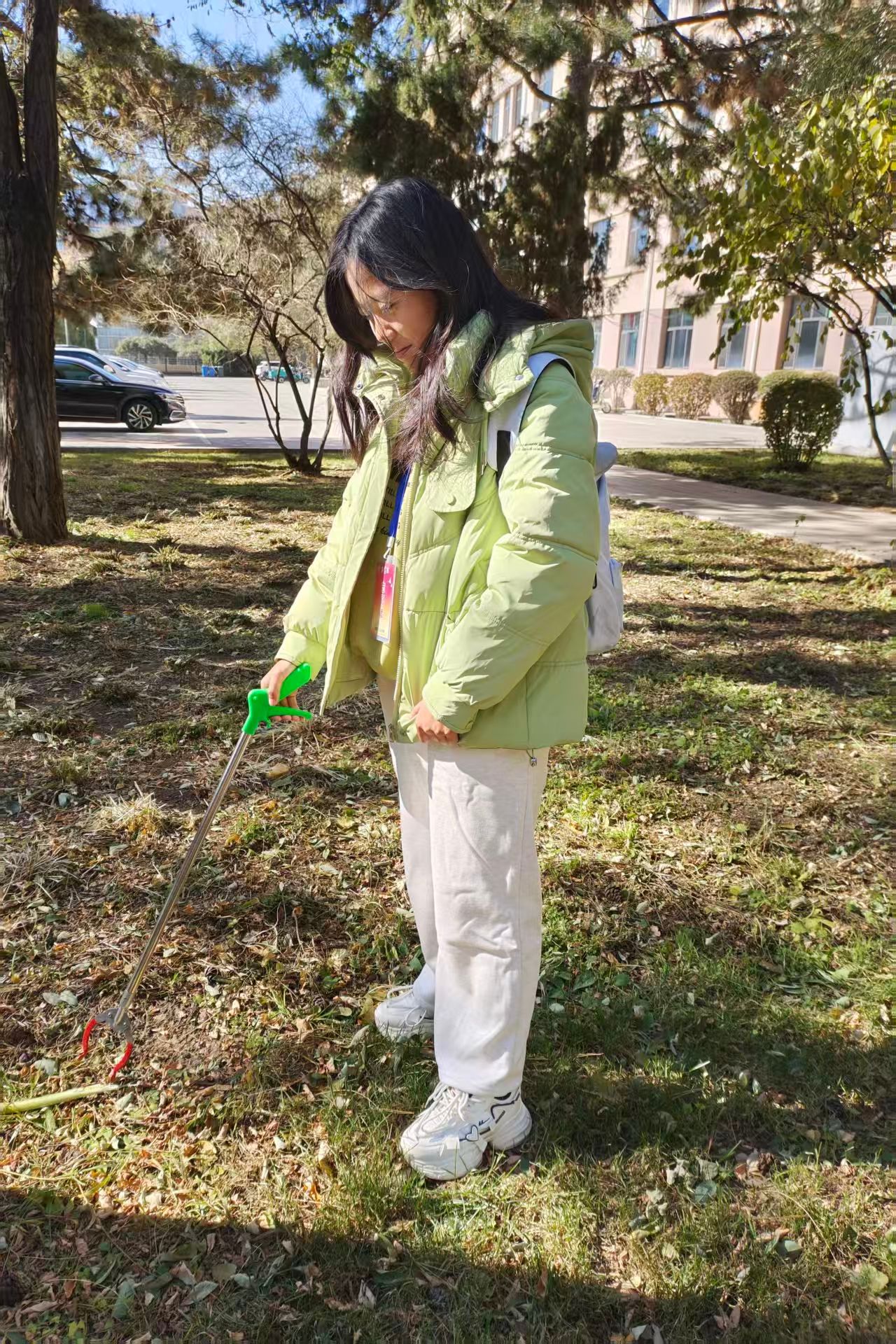 活动伊始,志愿者们穿梭在树木间,手持镊子,俯身清扫路面,认真捡起隐藏在草丛和角落里的纸屑、杂物,配合默契,不放过卫生死角。大家分工明确,尽管寒风阵阵,落叶不断飘落,但志愿者们热情不减。