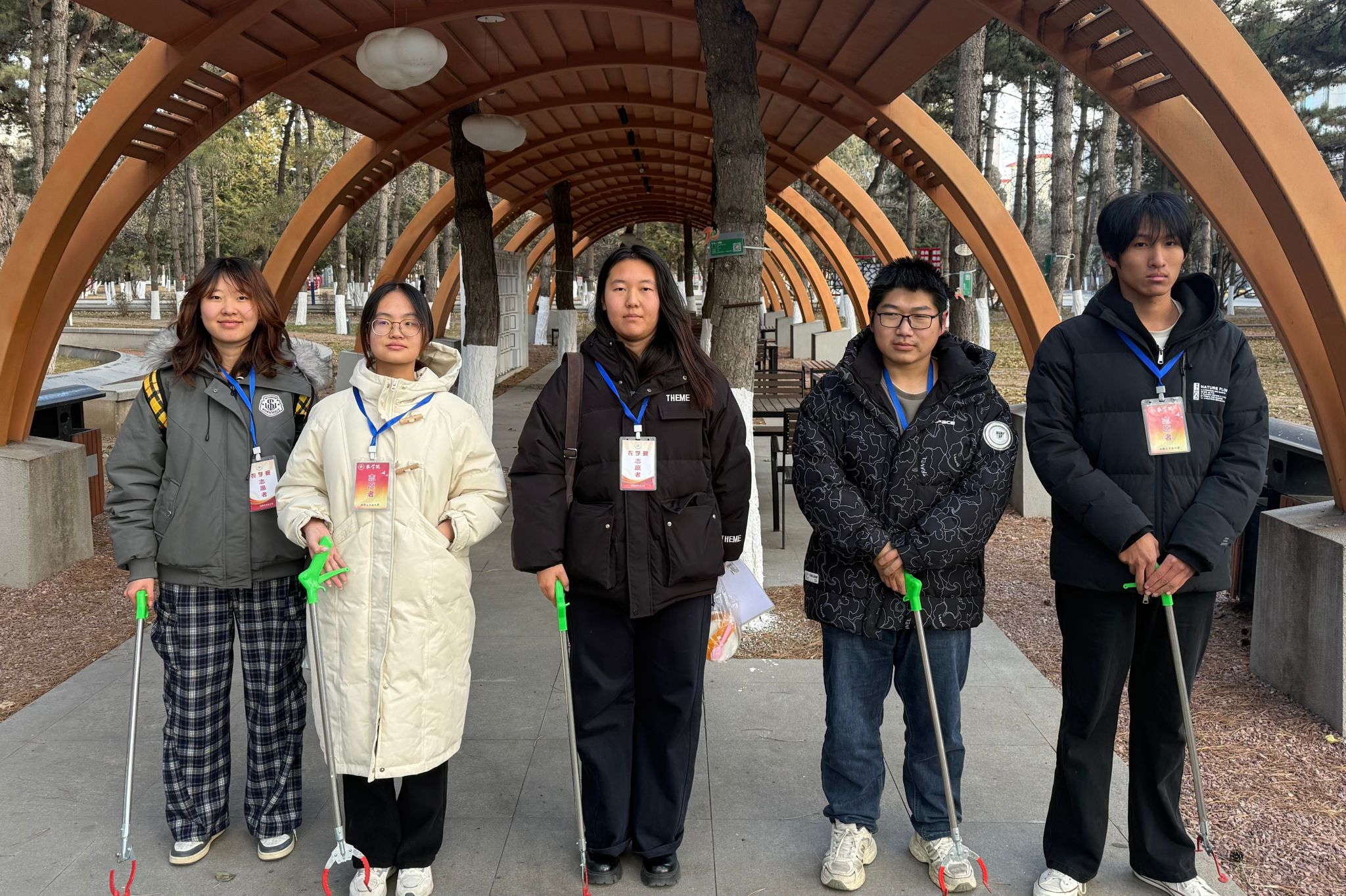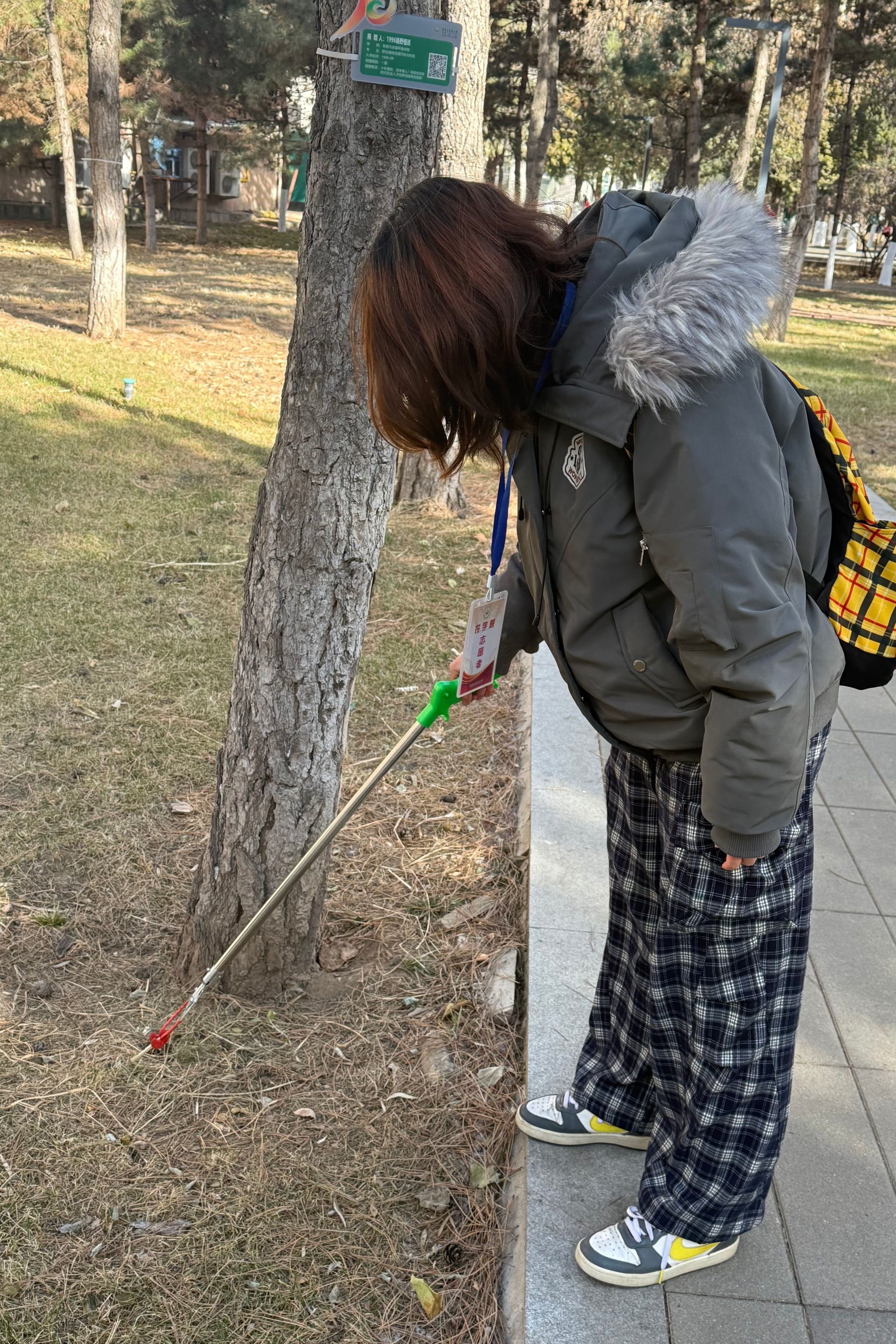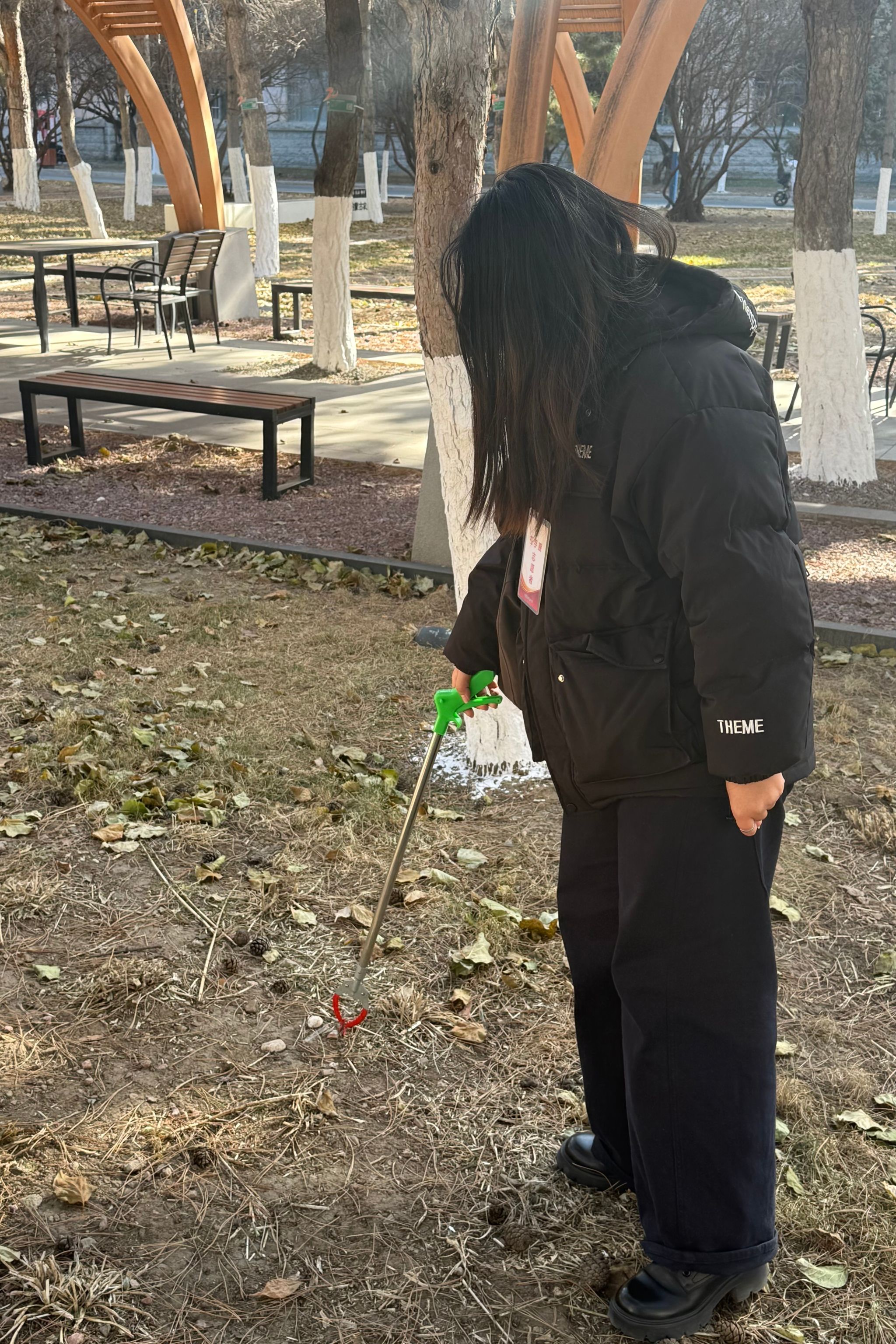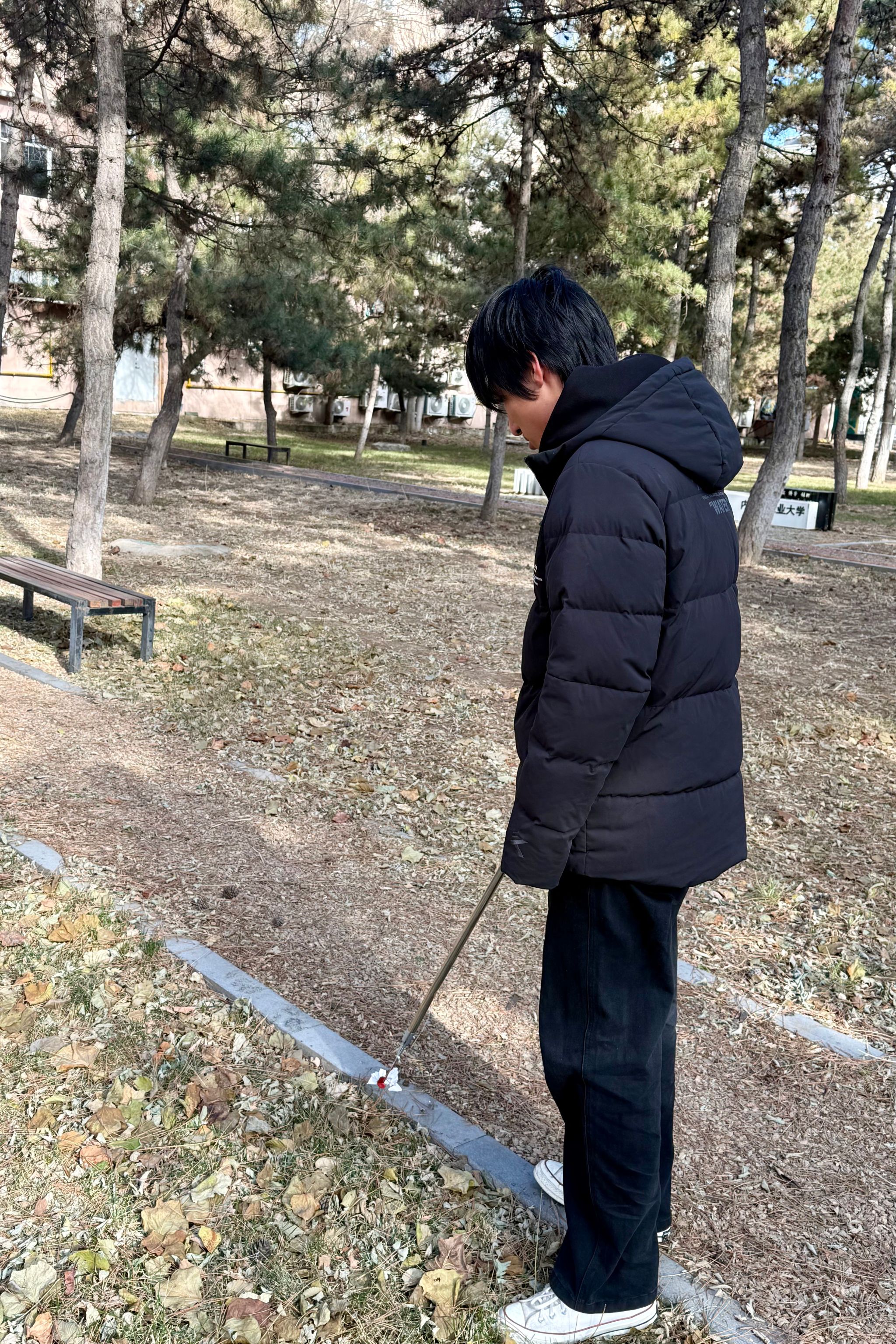 活动伊始,志愿者们提前集合,有序领取垃圾夹、分类垃圾桶等清扫工具,在简单明确分工后迅速投入工作。部分志愿者把凉亭中的桌椅摆整齐,清理干净桌椅周边的垃圾。另一部分志愿者则俯身穿梭在绿植间,用垃圾夹精准夹取藏匿在草丛、树根处的细小垃圾,彻底清除卫生死角。清扫过程中,大家相互配合、高效协作,对收集的垃圾按可回收、其他垃圾进行分类投放,兼顾清洁效果与环保理念。经过一番忙碌,校友林内步道洁净通畅,绿植周边无垃圾残留,整体环境焕然一新。