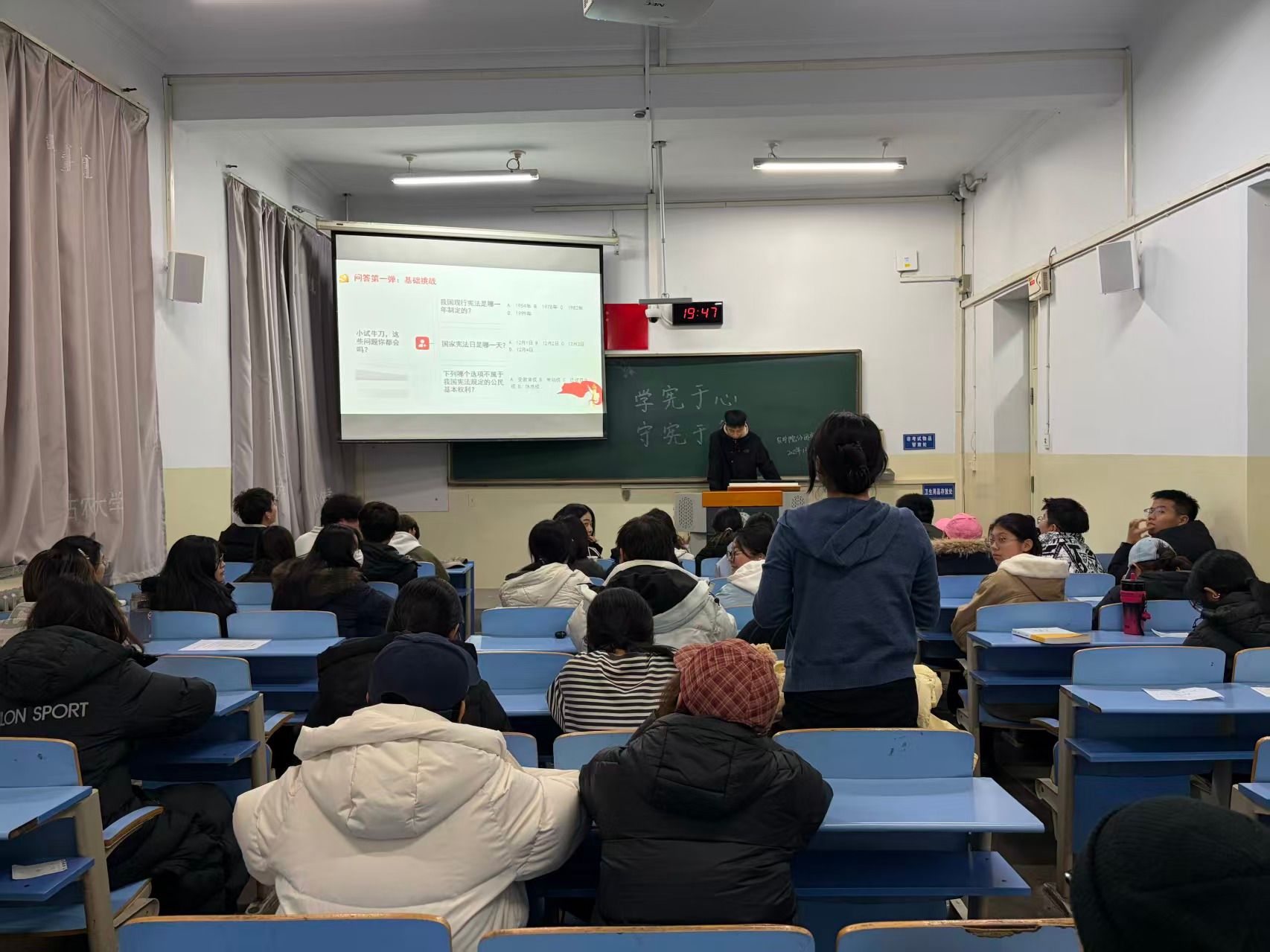 活动伊始,主持人围绕宪法的起源、发展历程、核心内容等展开介绍。在宪法知识问答环节,现场气氛热烈高涨。主持人围绕PPT讲解的重点内容,设置了单选、判断等多种题型,涵盖宪法基本原则、重要条款、法治常识等多个方面。