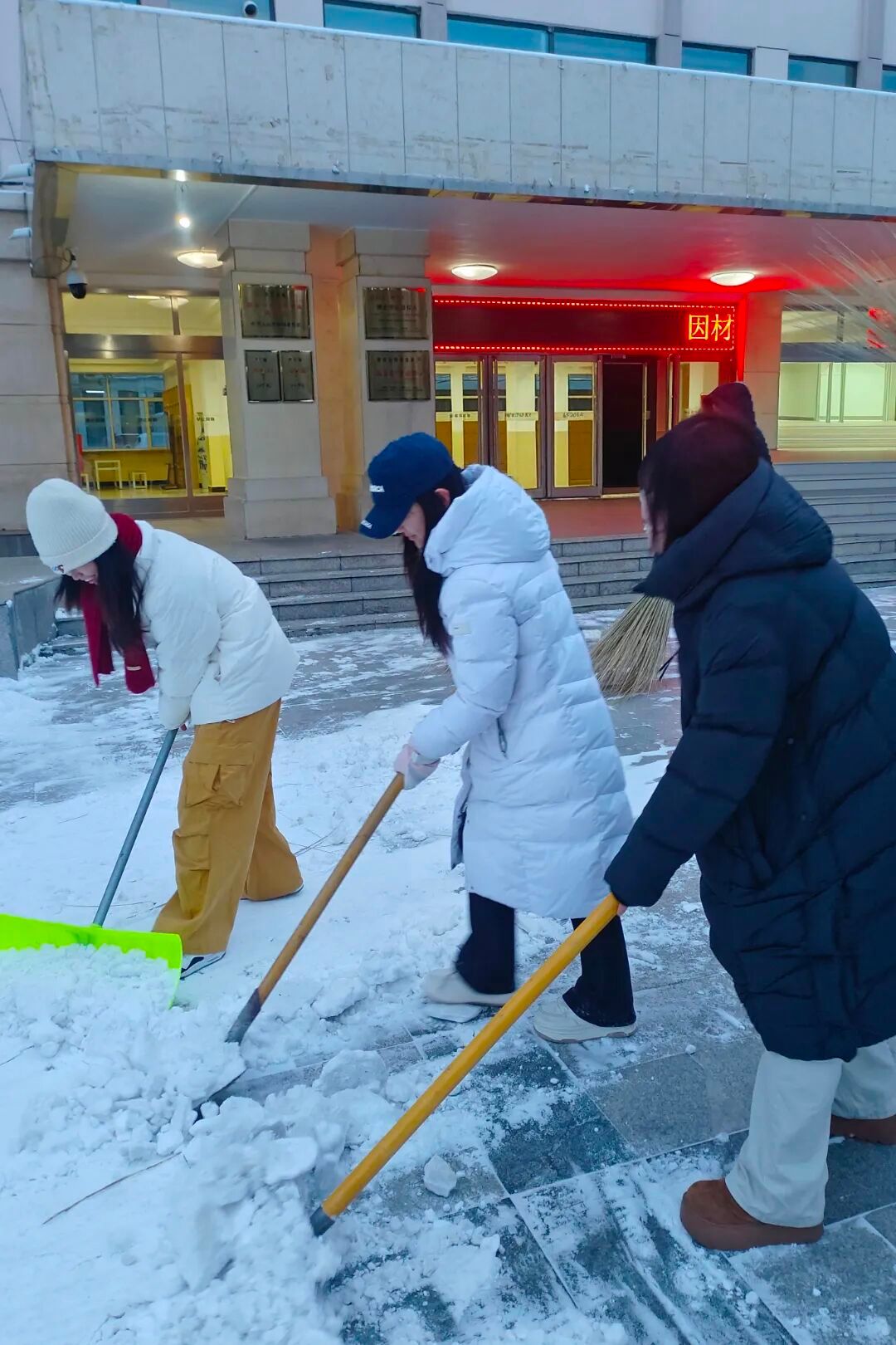 接到清扫通知后,分团委成员携带铁锹、扫帚等工具,在指定区域有序开展作业。活动中,同学们分工明确、默契配合,有的挥锹铲冰,有的挥帚扫雪,有的合力清理堆积的雪堆,不畏严寒、干劲十足。经过数小时的奋战,校园内主要通行道路的积雪结冰被彻底清除,为师生开辟出了安全畅通的出行通道。