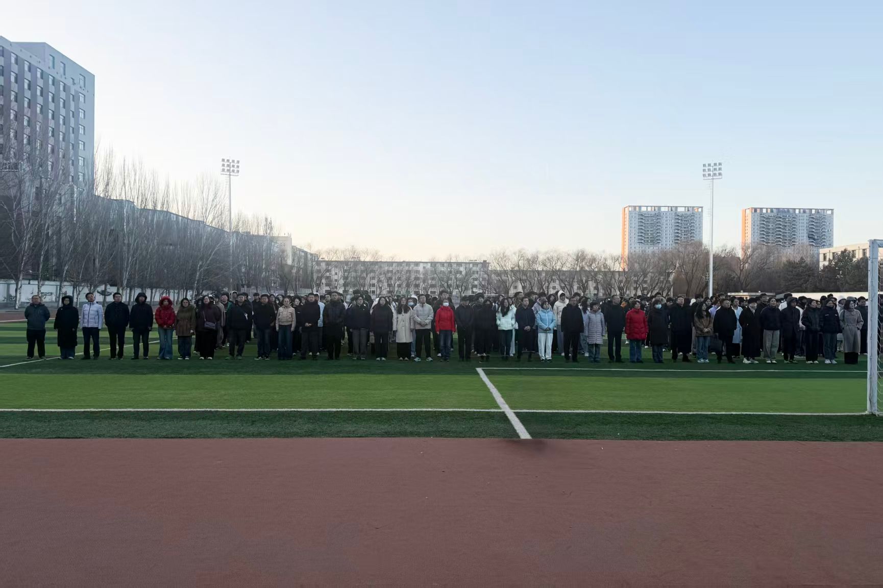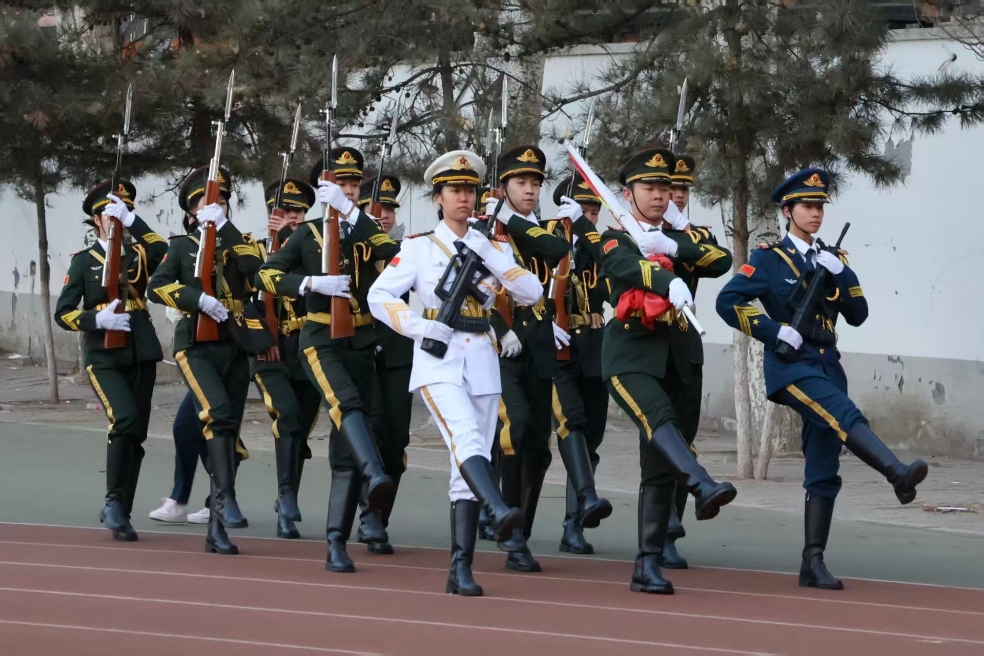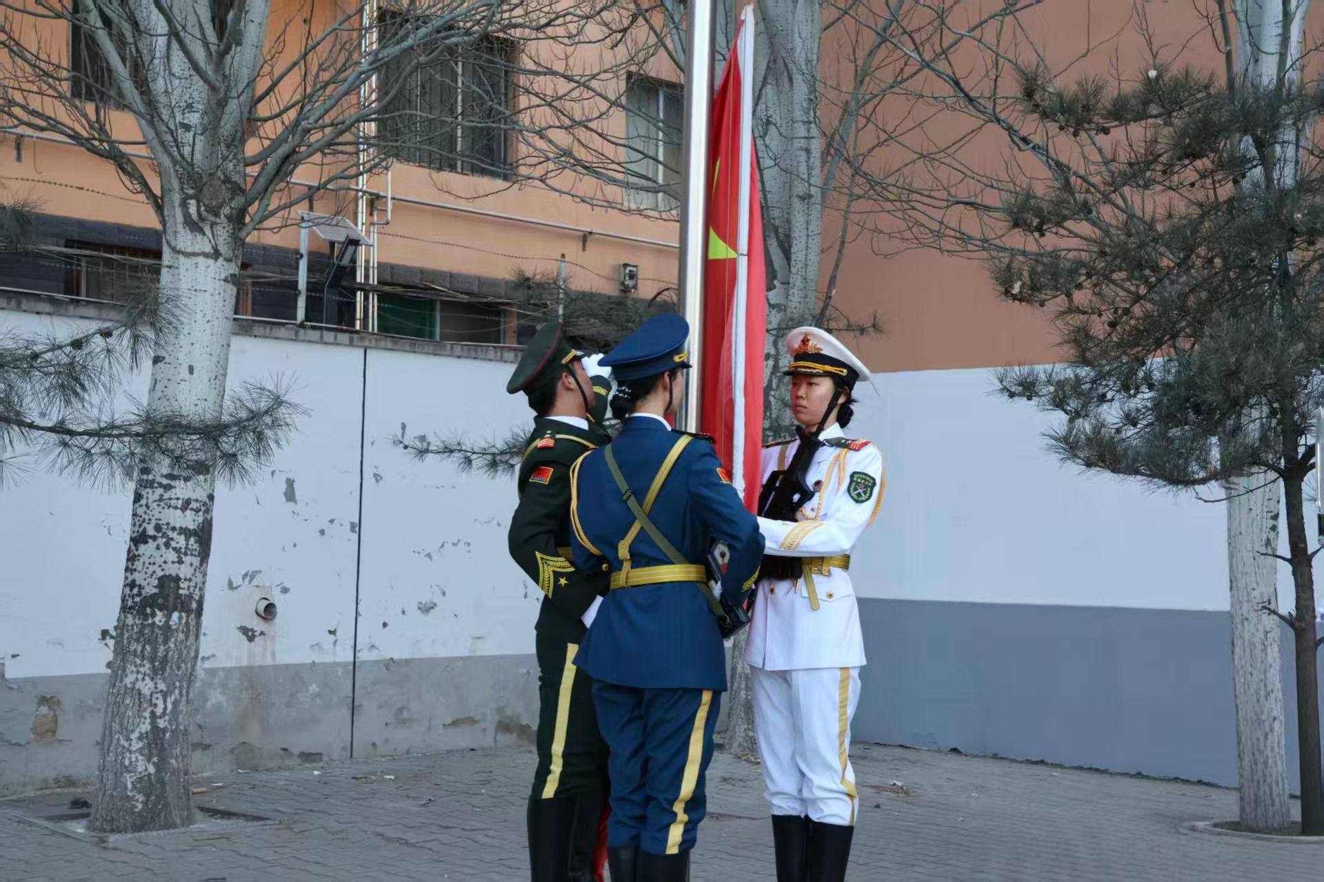 晨曦微露,国旗护卫队的队员们护送着五星红旗缓步走向升旗台,在全体师生肃立注目下,国旗迎着朝阳冉冉升起、随风飘扬。
